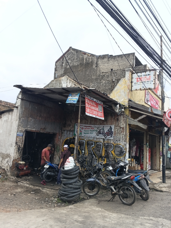 - "An old, weathered motorcycle repair shop features graffiti and various signs, including advertisements for "ERA JACK DIJUAL SUKIAWAN 0813 1309 5897," "Bebas Slip, Motor Kopling Makin Sip!," and "TOKO PANCING DEDE NOME" by FM-rgG523, licensed under CC BY 4.0