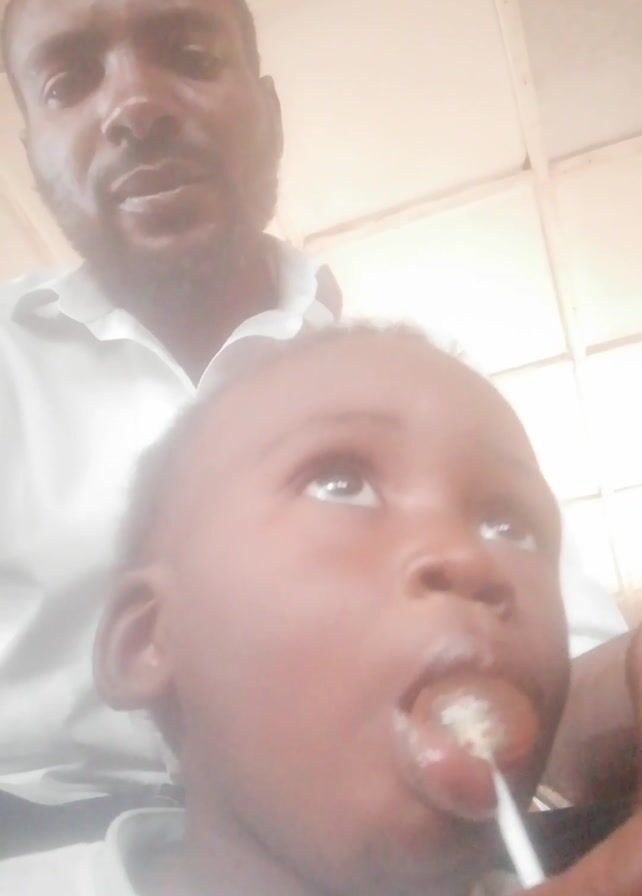 A video from a low-angle perspective shows a young boy and a man, both with dark skin. The boy is in the foreground wearing a white shirt and appears to be lying down, looking up at the camera. He has a lollipop in his mouth. Behind him, slightly out of focus, is the man, also wearing a white shirt. He has short hair and a beard, and he is also looking down at the camera with a slight smile. The background appears to be a room with light-colored walls, possibly made of wood panels. The lighting in the video is bright, and the image is slightly overexposed.
