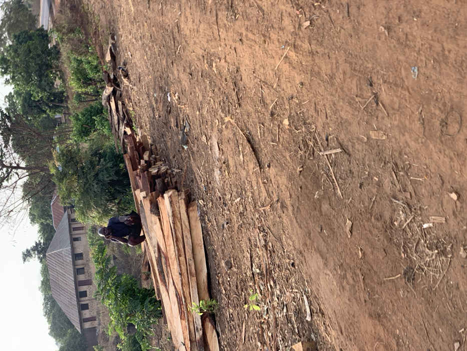 A man squats next to a stack of lumber. The lumber is arranged lengthwise in the middle of the frame. Beyond the lumber is a dirt path. Trees line the border. A house is visible to the left of the stack of lumber. The ground is brown and covered with twigs and debris.