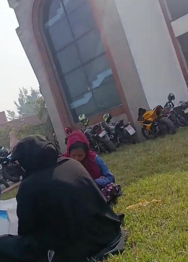 Several women in hijabs are sitting on the grass near a building. Some are looking at papers and documents. A small child is with them. Motorcycles are parked nearby. The weather is sunny.