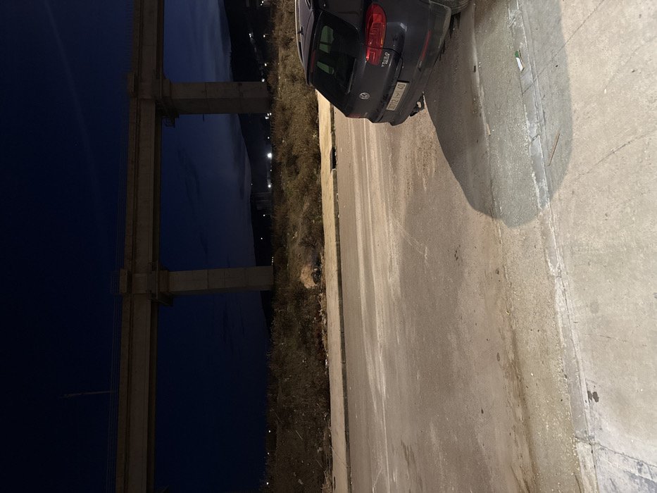 A dark-colored Volkswagen car, partially in the frame, is parked on a concrete road with a curb. The road runs alongside sparse vegetation, bordering a dark blue expanse, possibly water or sky at night. A large concrete structure with vertical pillars and horizontal beams is visible in the background, casting long shadows. The photograph appears to be taken at night or during twilight, with artificial lighting present in the distant background along the vegetation.