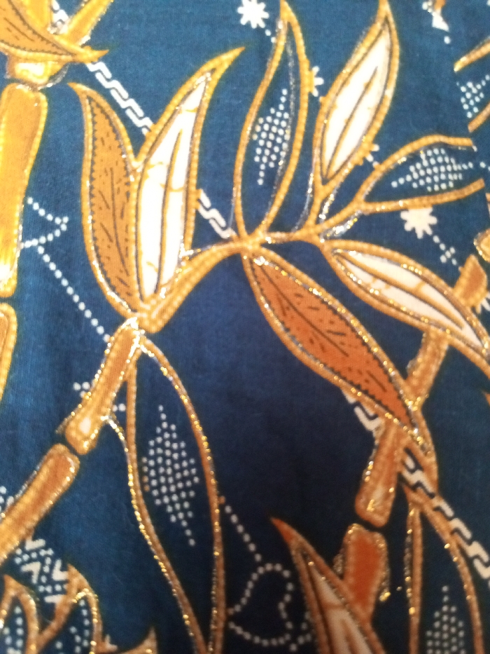 - "dark blue fabric with a golden botanical pattern" by FM-WQFBv2, licensed under CC BY 4.0