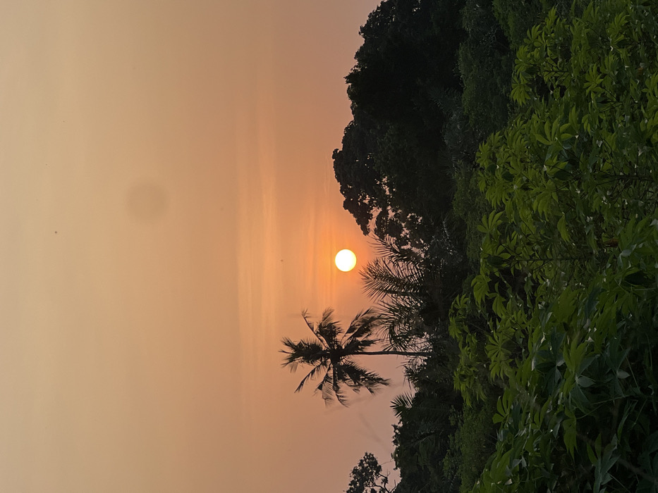 A vibrant sunset casts an orange glow over a tropical scene. A lone palm tree stands silhouetted against the bright sun, while lush green vegetation lines the right side of the frame. Darker trees rise in the background, creating a contrasting backdrop. The sky is hazy, with slight imperfections marring the otherwise smooth canvas.