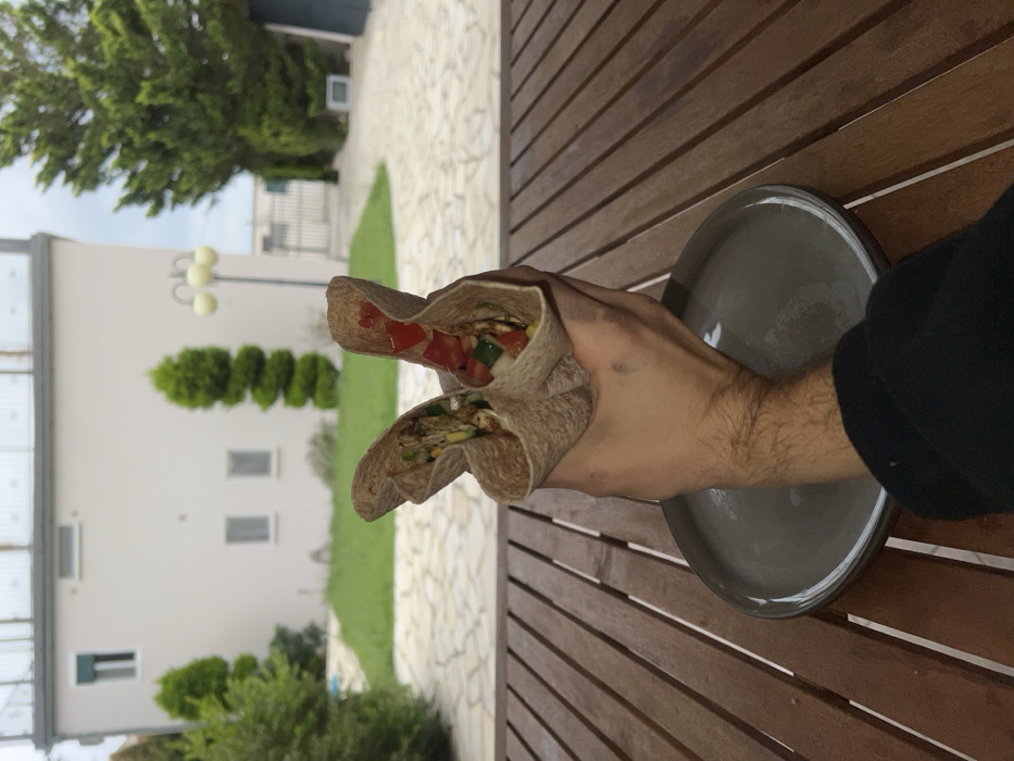 - "The image displays a human hand holding two food wraps over a dark grey circular plate on a brown slatted wooden table in Sutomore, Montenegro" by FM-CjoWV2, licensed under CC BY 4.0