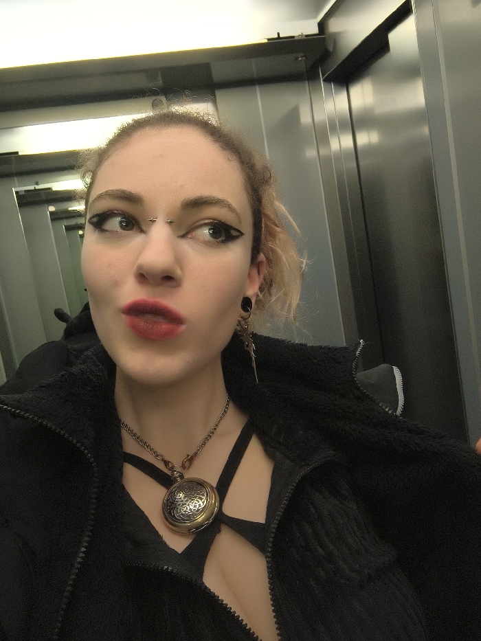 A young woman poses for a selfie in what appears to be an elevator. She has fair skin, light brown hair pulled back, and wears striking eye makeup. A piercing is visible on the bridge of her nose. She's dressed in a black top and a black, sherpa-lined jacket. A large, ornate pendant hangs from a chain around her neck. The elevator walls are gray, reflecting light and creating an illusion of depth.