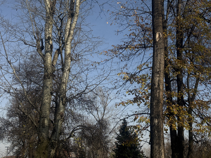 The image depicts a clear daytime scene dominated by trees in Brčko, Bosnia and Herzegovina, during what appears to be late autumn or early winter. The sky is uniformly light blue with no cloud cover. In the foreground and midground, multiple deciduous trees are visible. On the left, a tall tree with pale, vertically striated bark and numerous bare branches extends towards the top of the frame. To its right, a dark-barked deciduous tree stands prominently, featuring a distinct, light-colored, irregular mark approximately midway up its trunk. This tree, along with others behind it on the right side of the frame, retains sparse yellow and golden-brown foliage. Towards the bottom center-right, a dark green coniferous tree is partially visible. The lowest portion of the image shows indistinct distant structures or ground features beneath the tree line. No people, animals, or active interactions are present.