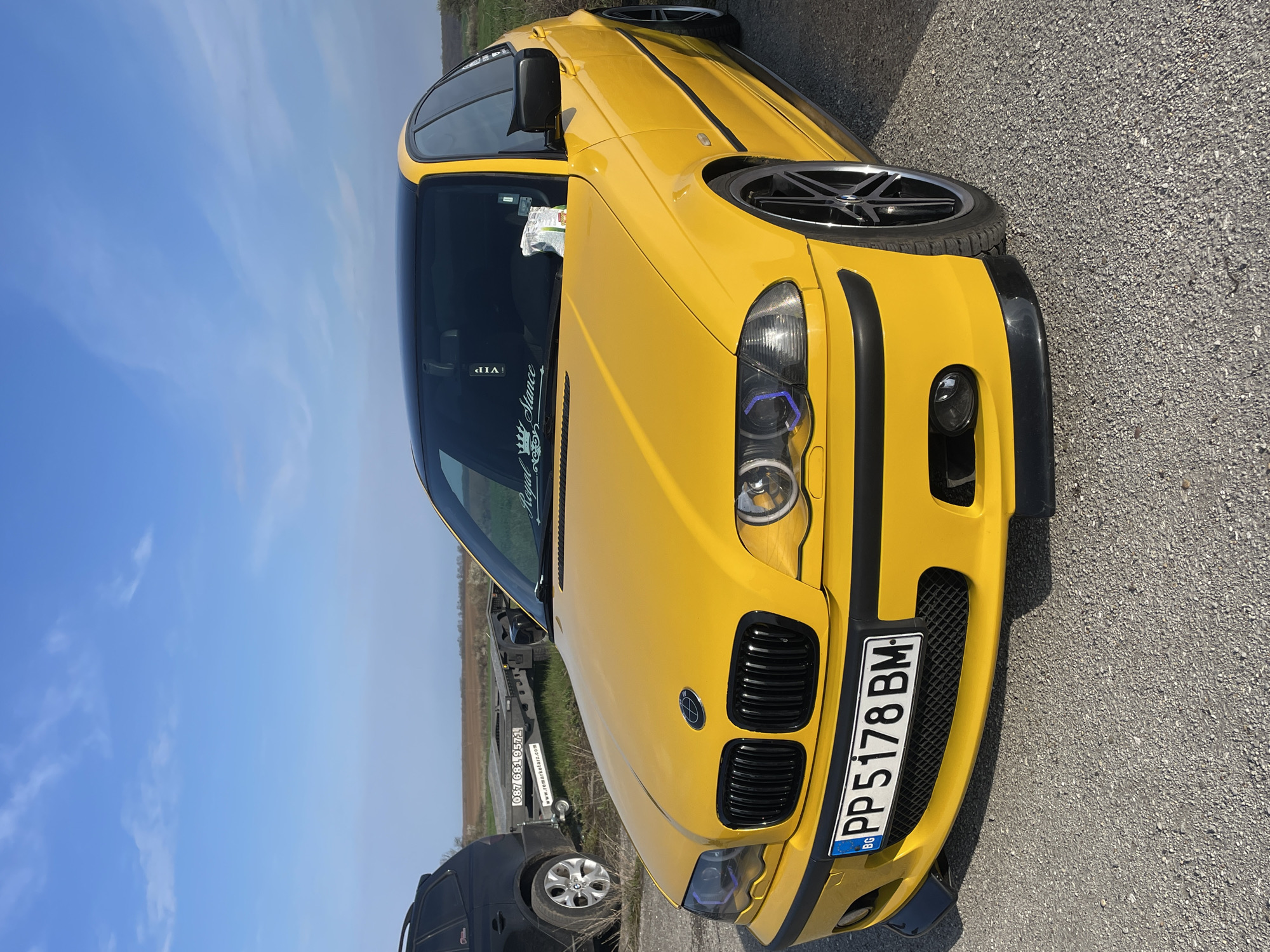 A yellow BMW, license plate PP 5178 BM, is parked on an asphalt road in Ostrovo, Bulgaria. The sky is blue. A dark-colored SUV and a tow truck are partially visible in the background. The BMW has black rims and custom headlights. The car has a "VIP Royal Stance" decal on the windshield.