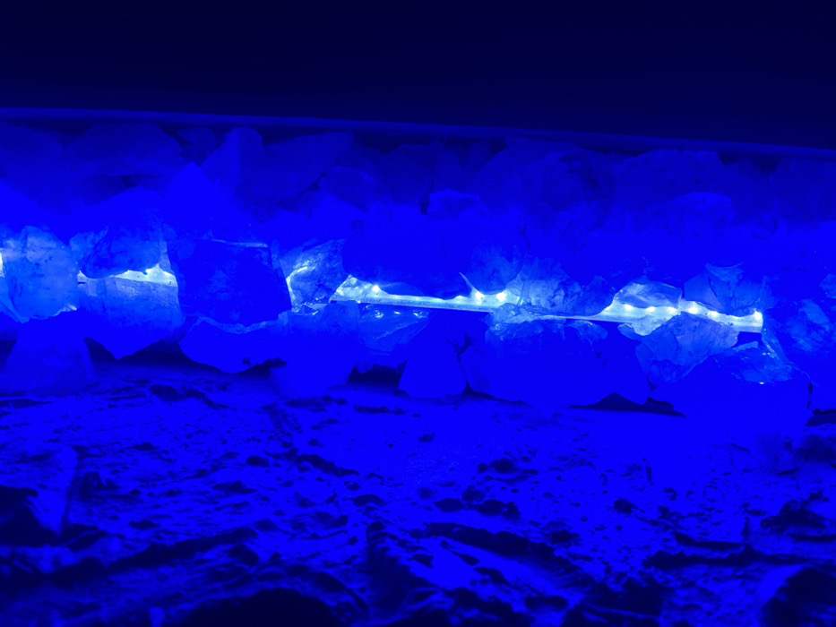 A close-up shot captures a rock wall illuminated with a vivid blue hue