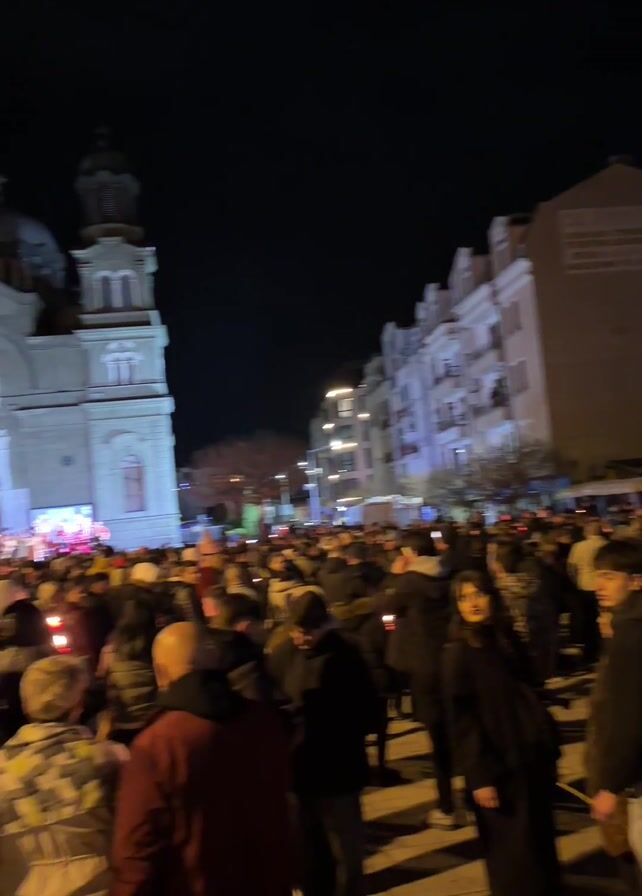 large crowd of people gathered in front of a church at night. Many individuals are holding lit candles. The church is lit up, and there are buildings visible in the background. The people appear to be attending a religious event or service.