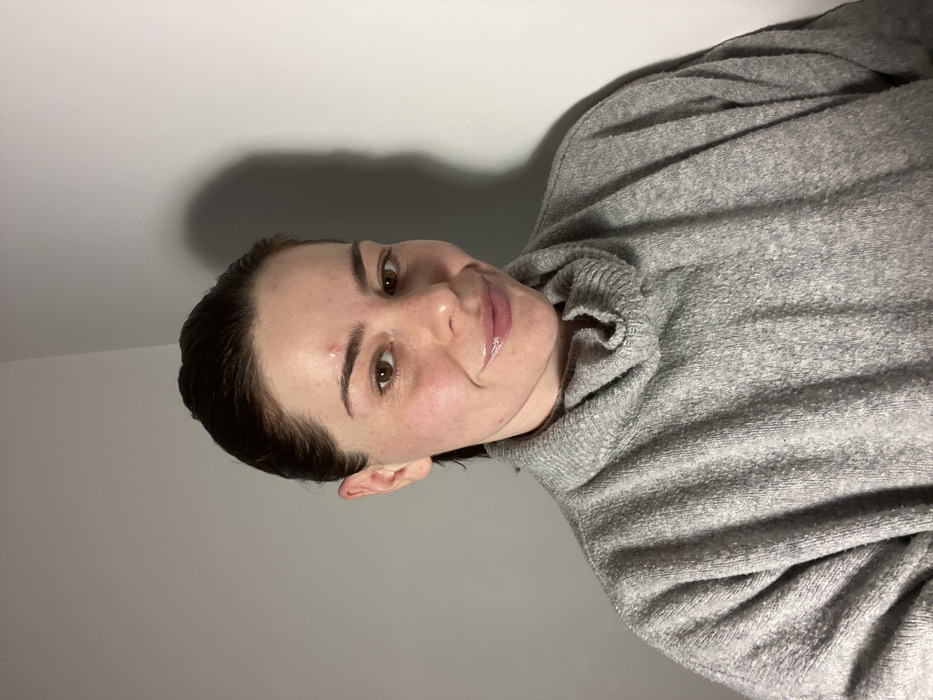 A woman with brown hair pulled back, light skin, and brown eyes smiles at the camera. She wears a gray turtleneck sweater. A slight blemish is visible on her forehead. Her lips are glossy. A shadow is cast on the plain gray wall behind her head. The lighting is soft and even, creating a casual and comfortable atmosphere.