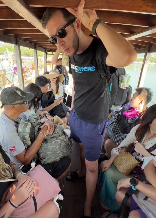 interior of a crowded boat, likely a longtail boat in Southeast Asia, due to the wood paneled ceiling. Several passengers are seated, while a man in a black T-shirt, blue shorts, and black sandals stands in the middle. He is wearing sunglasses and has a beard. He is making a gesture with his hands near his head, possibly imitating ears or horns. Other passengers include a man in a gray shirt with a baseball cap, holding a large camouflage backpack, and several women with bags and hats. The environment outside the boat is visible with flowers and other boats. The overall atmosphere seems casual and potentially tourist-oriented.