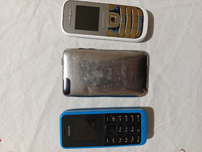 Three devices are arranged vertically on a white surface. At the top, a white and gray Samsung feature phone with a small screen. Below that, a silver iPod with a black click wheel. At the bottom, a blue Nokia feature phone with a small screen and physical number buttons. Text on the devices includes "NOKIA" on the bottom device, "SAMSUNG" on the top device, and "iPod" on the middle device. The items appear to be lying on a sheet or tablecloth with subtle folds.
