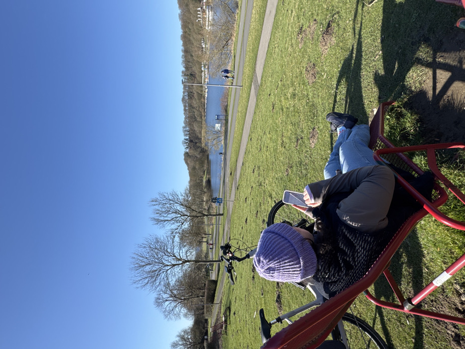 This image depicts a sunny day at Kemnader See, Witten, Germany, observed from a grassy embankment. In the foreground, a person is seated in a red metallic reclining chair, facing away from the camera. The individual wears a purple knitted beanie, a dark vest over a light-colored long-sleeved top, light blue jeans, and dark shoes. They are holding a white smartphone, which has a visible crack on its screen, in both hands; their hands are partially covered by light-colored wrist coverings. A silver and black bicycle is positioned to the left of the chair. The grassy area in the immediate vicinity exhibits several small mounds of disturbed earth. Midground elements include a paved pedestrian and cycling path running horizontally through the scene. Two individuals are seen walking away from the camera on this path towards the right. A blue rectangular sign with white directional arrows is visible alongside the path. Further along the path near the water, a solitary figure stands. The background features the expansive blue waters of Kemnader See. On the far side of the lake, a densely forested embankment rises. A multi-decked white passenger boat is visible on the lake towards the right side of the frame. Numerous bare deciduous trees line the paths and distant shoreline under a clear blue sky.