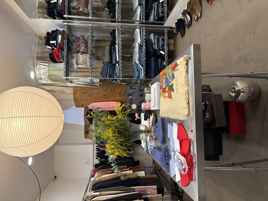 A store interior features a metal table with a Gucci scarf, pink and white decor, and blue and red items. A vase of yellow flowers sits nearby. Clothing racks hold neatly folded denim, bags, and garments. A spherical paper lantern hangs from the ceiling, illuminating the space. The overall impression is a well-organized and stylish retail environment.