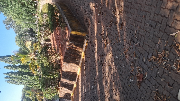 paved brick walkway with scattered leaves and shadows cast by the sun. A low brick wall lines the walkway, featuring yellow accents and green foliage. The background displays various trees, including tall, slender evergreens and a palm tree. A clear, blue sky is visible above the trees. The picture is taken at an angle, creating a dynamic perspective of the scene.