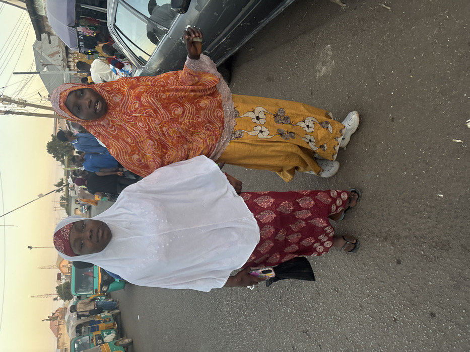 Two women stand on a city street in traditional attire. The woman closest to the camera wears a white head covering and a red patterned skirt. The other woman, standing slightly behind her, wears an orange and red patterned head covering with a yellow skirt. Both appear to be in a busy area, with vehicles and people visible in the background. The photo is taken from an above-eye level angle.