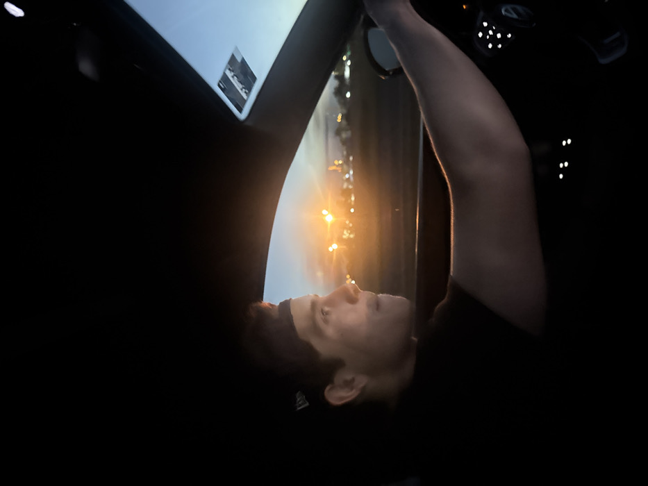 A dark image depicts a person's face in profile, illuminated against a backdrop of city lights. They appear to be in a car, looking out a window or sunroof. A raised arm is partially visible. The lighting suggests either dawn or dusk. The overall impression is one of contemplation or introspection amidst the urban landscape. The picture is upside down.