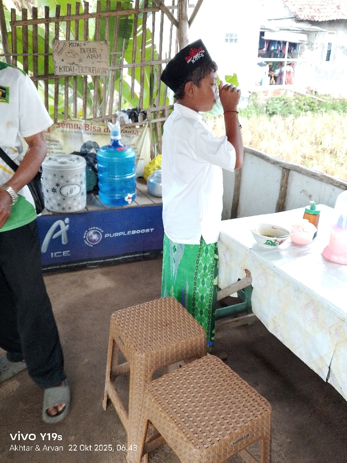 The image displays an outdoor dining area, likely a food stall (Kedai Bubur Ayam), situated in Wanguk, Indonesia. A young male, dressed in a white short-sleeved shirt, a green patterned sarong, and a black peci with red embroidery, stands on the right side of the frame, actively drinking from a clear glass. He faces left, with his right hand holding the glass to his mouth. Adjacent to him is a rectangular table covered with a white patterned tablecloth, displaying a white bowl containing food (possibly porridge), a small light pink bowl, a green plastic squeeze bottle, and a pink lidded plastic container. In the foreground, two brown woven plastic square stools are positioned on a concrete floor. To the left, the lower torso and legs of another male are visible; he wears a white shirt with green trim and a logo on the chest, dark pants, and light grey slide sandals. Behind this individual, a rustic counter or shelf, constructed from wooden planks, holds a large blue plastic water dispenser bottle with a spigot, a silver-colored insulated container with a snowflake-like design, and a smaller white container. A blue banner below the counter displays "Ai ICE" and "PURPLEBOOST" branding. The background features a wall constructed from vertical bamboo slats. Attached to this wall are two white rectangular signs, both bearing the text "KEDAI BUBUR AYAM" (Chicken Porridge Stall). Green foliage, including banana leaves, is visible through the bamboo. Beyond the dining structure, a yellowish field extends to the horizon, where a residential building with a reddish-brown tiled roof is partially visible. The scene is illuminated by natural daylight. A watermark at the bottom left indicates "vivo Y19s Akthar & Arvan 22 Okt 2025, 06.43."