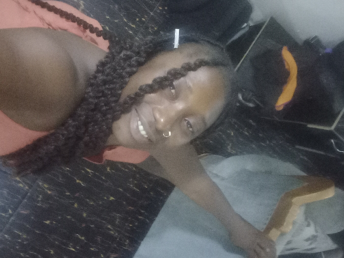 A woman with dark skin, dark eyes, and a nose ring smiles toward the camera. Her hair is styled in dark brown braids with a white clip holding some strands back. She wears a coral-colored top. The background features a patterned floor and some furniture, including a black cabinet with an orange item inside. She is holding a light brown, possibly wooden, object in her hand, partially obscured by a light gray cloth.