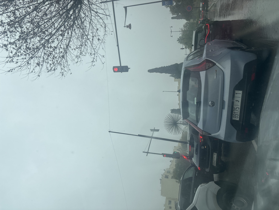 The scene depicts a street intersection at Place Florence in Fez, Morocco, during overcast weather with wet asphalt, suggesting rain or recent precipitation. Multiple vehicles are stationary in traffic. In the immediate foreground, a light blue/grey MG hatchback, bearing Moroccan license plate "89175 | و 1", is positioned. Directly behind it is a dark hatchback with license plate "85043 | ب 15". A white van is partially visible on the far left, and a dark sedan or SUV on the far right. An overhead traffic light displays a red signal, halting the vehicular flow. In the mid-ground, a distinctive large metallic spherical sculpture with radiating spikes, a landmark of Place Florence, is visible to the left of the center. City buildings, tall evergreen trees, and bare deciduous tree branches line the street. Overhead power lines and street lighting infrastructure are present. No pedestrians are distinctly visible.