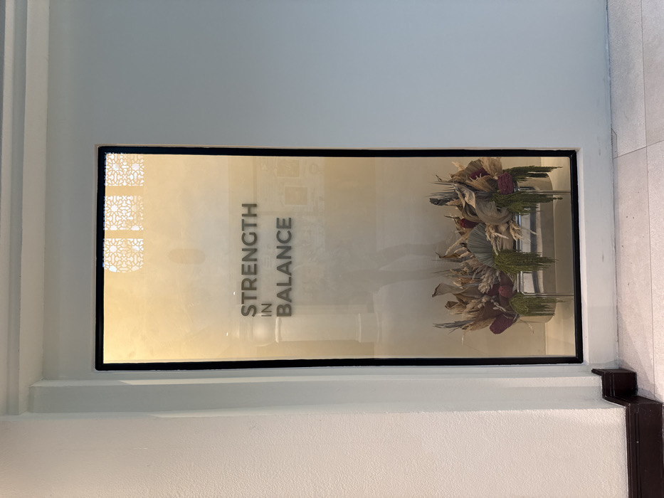 A horizontal rectangular display case with a black frame is inset into a white wall. Inside, the words "STRENGTH IN BALANCE" are vertically aligned. To the right, a floral arrangement of dried flowers and greenery rests on a reflective surface, creating a doubled, mirrored effect. A window with an ornate pattern is visible in the background. Tiled flooring appears to the right of the frame.