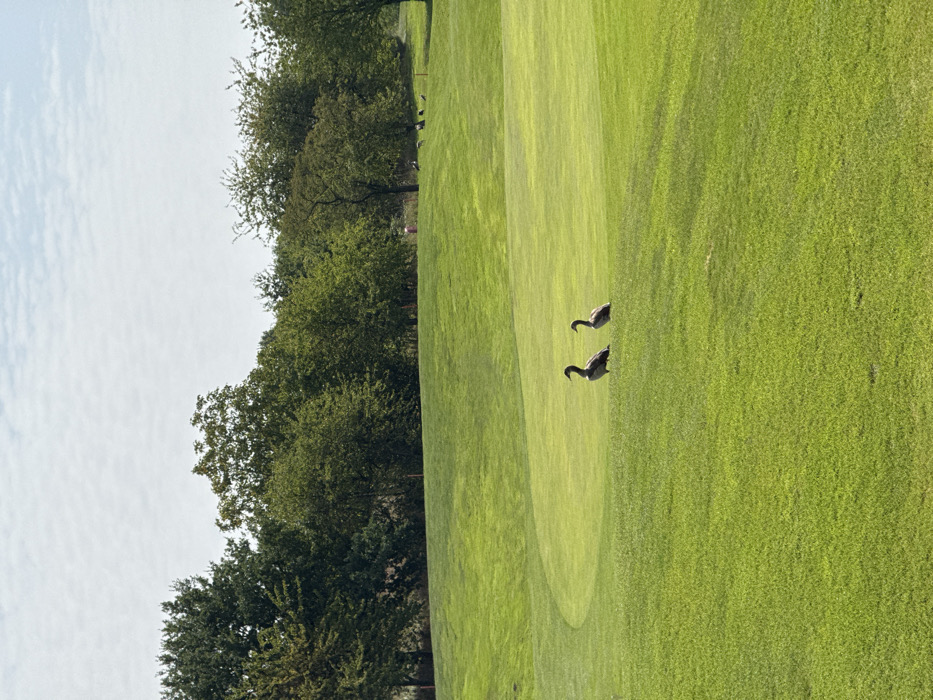 The image depicts a golf course in Lenningen, Luxembourg, under a partly cloudy sky. In the mid-ground, two geese stand on a manicured green area distinct from the surrounding fairway, which features a curved boundary. In the background, on a gentle slope, approximately five additional geese are visible near a partially obscured red golf course marker. A dense line of deciduous trees forms the horizon. The scene is illuminated by natural daylight. No human presence is observed.