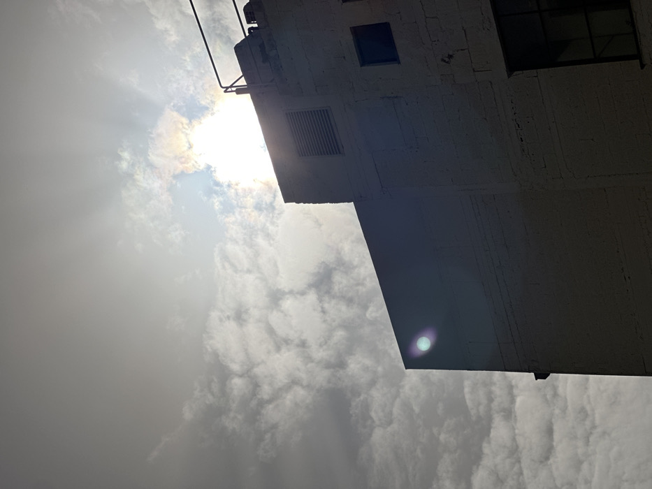 The image displays a portion of a building in Tel-Aviv, Israel, under a bright, overcast sky. The sun is visible in the upper-right quadrant, partially obscured by gray and white clouds, creating a strong glare and visible sunrays. Some clouds exhibit mammatus-like formations. The building occupies the lower-right and central-left portions of the frame, appearing heavily shadowed and silhouetted against the intense light source. Its facade shows faint texture, consistent with light-colored brick or concrete blocks. Features visible on the building include a dark metal railing along its top-right edge, a rectangular ventilation grate on an upper section, and at least two dark rectangular windows on the right side. A prominent circular, purplish-blue lens flare is present on the building's dark facade, slightly left of the image center. No individuals or discernible actions are present in the scene.