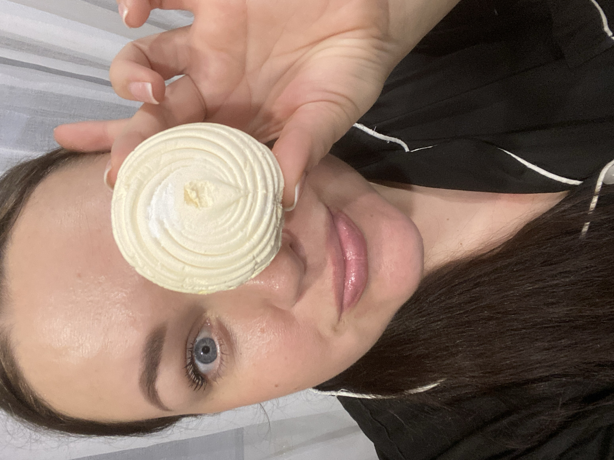 A woman is holding a white, circular object with a swirl pattern in front of her eye. She has light skin, blue eyes, and dark brown hair. She is wearing a black top with white piping. The background appears to be a light grey or white wall with faint vertical stripes. There is no evidence to suggest the location is Sochi, Russia.