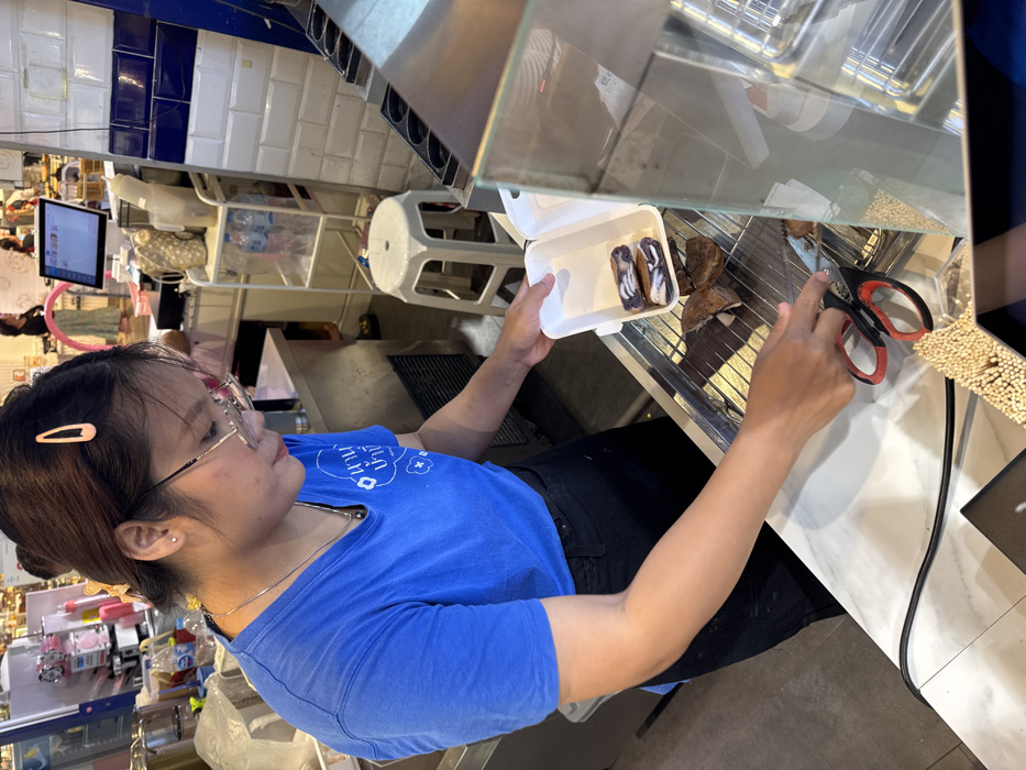 The image depicts an individual engaged in food preparation within a food stall or bakery environment located in Wichit, Thailand