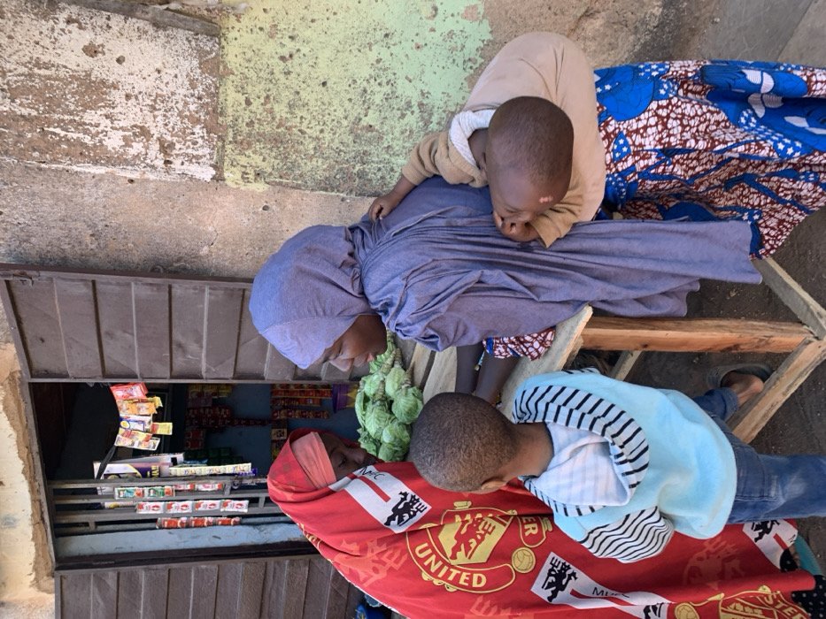 A woman in a lilac hijab sits outside a small shop, her gaze directed downward. A child in a tan jacket clings to her back. A second child, dressed in a blue and white striped jacket, stands beside a red blanket with a Manchester United logo. Cabbage is also seen near the shop. The shop displays snacks. The scene appears to be set in a developing nation.