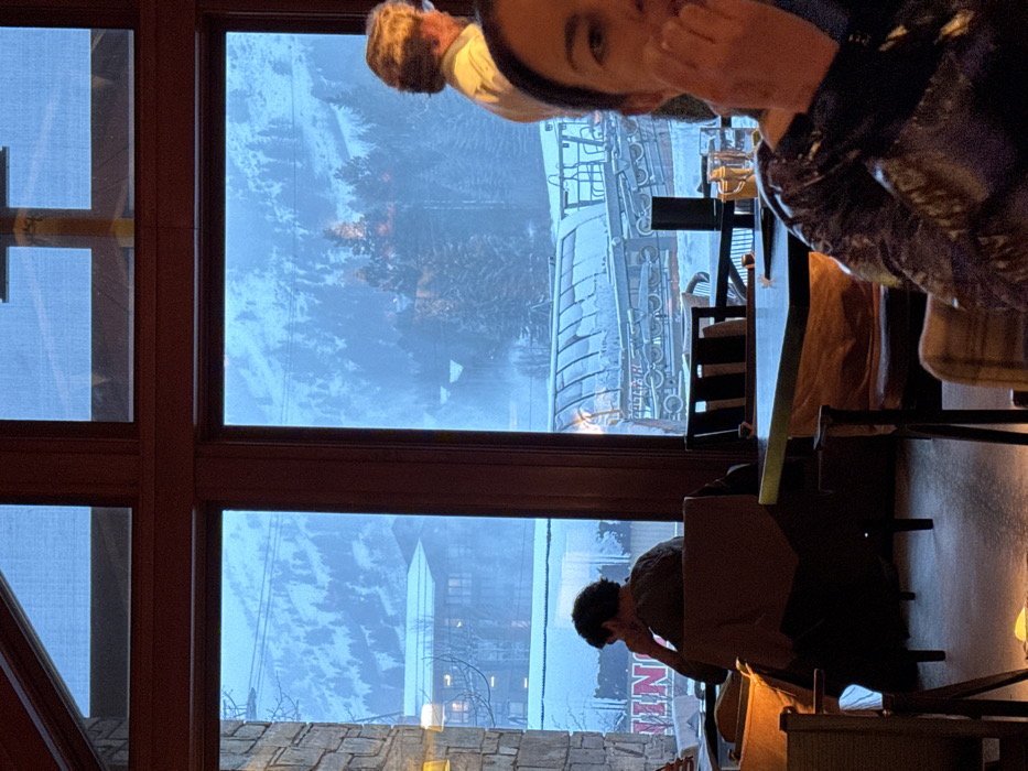 A window with wooden frames offers a view of snow-covered terrain and a tall building or structure, possibly a ski lift or similar facility. Indoors, two people are partially visible. One is near the window with a hand to their mouth, and the other is seated at a table, obscured. A beverage glass sits on the table. The scene appears to be taken inside a restaurant or lodge, during snowy weather.