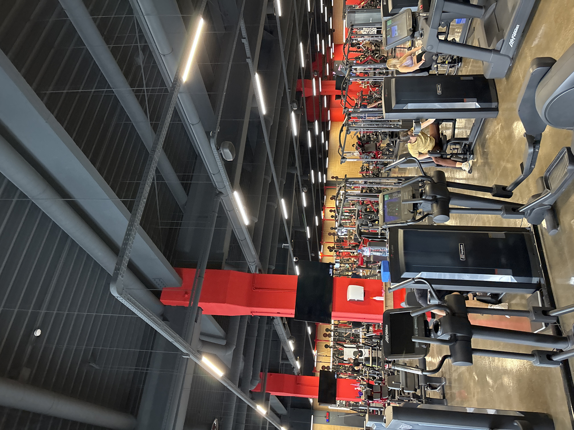 interior of a gym in Plovdiv, Bulgaria. Rows of treadmills, elliptical machines, and stationary bikes fill the space. Several people are working out. The gym has a high ceiling with exposed pipes and structural beams. Lighting fixtures are evenly distributed. Red painted beams are visible throughout the gym. The floor is a polished concrete or similar material.