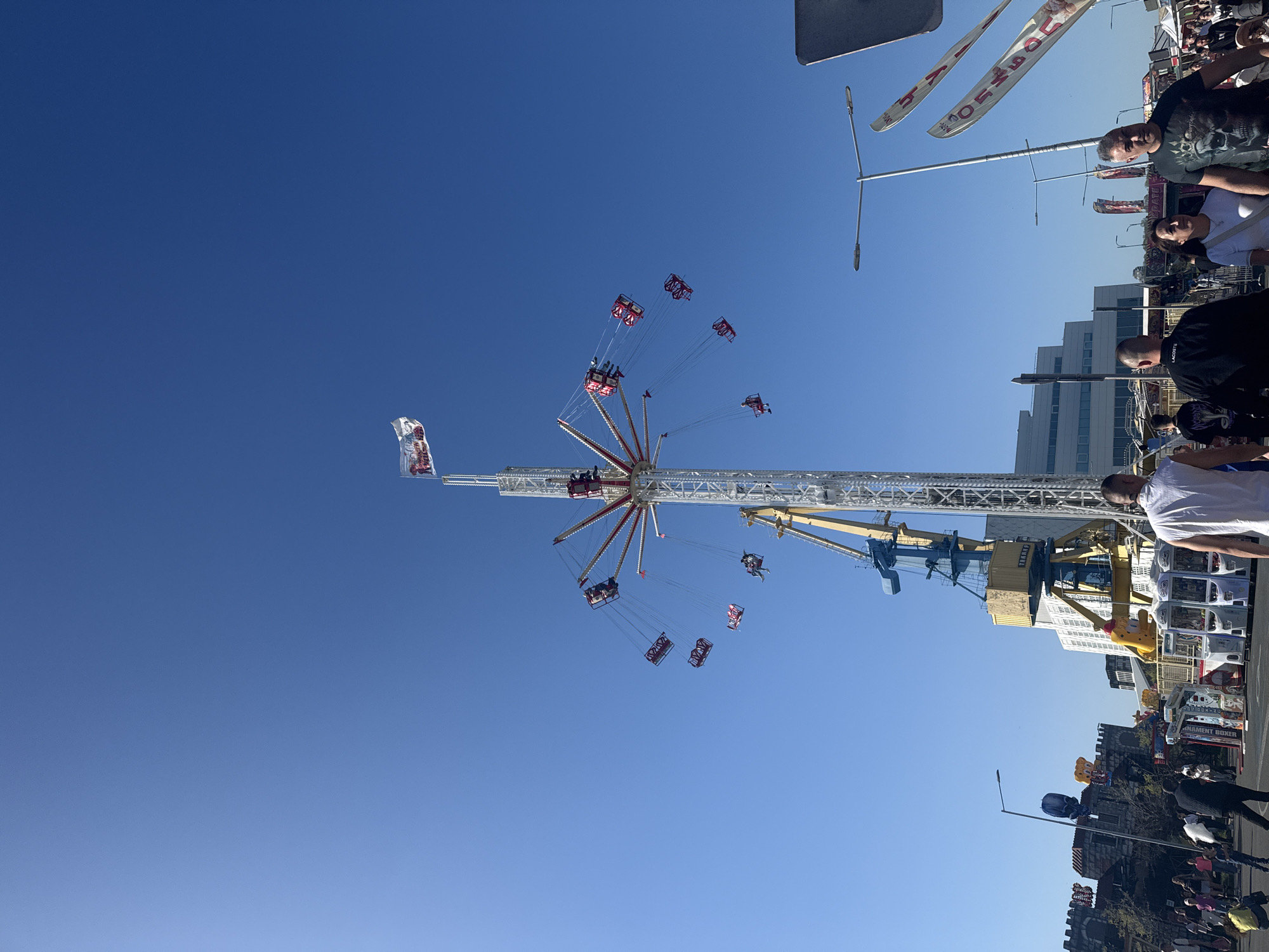 fairground in Burgas, Bulgaria. A large swing ride, with multiple seats suspended on chains, is in operation against a clear blue sky. There are multiple people in the seats of the swing ride. To the right, there are people walking around the fair. To the right of the swing ride, there are other fairground attractions, including a crane game with stuffed animals inside. In the background, there is a building and other objects on the fairground.