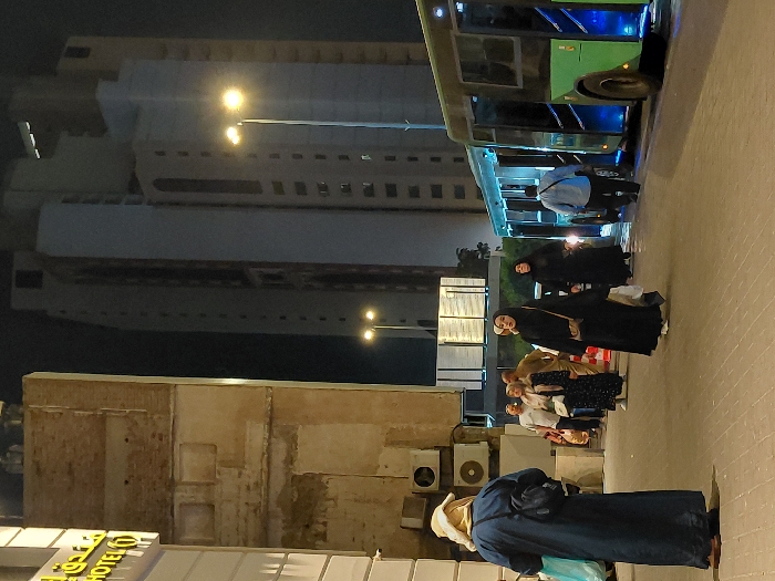 A nighttime street scene shows a group of people standing near a bus. Several women wearing hijabs and dark clothing are prominent in the middle ground. Buildings of varying heights line the street, illuminated by streetlights. An older, weathered building stands to the left, with air conditioning units mounted on its wall. A hotel sign is visible in the lower left corner. One person in a dark blue garment stands in the foreground, facing away from the camera.