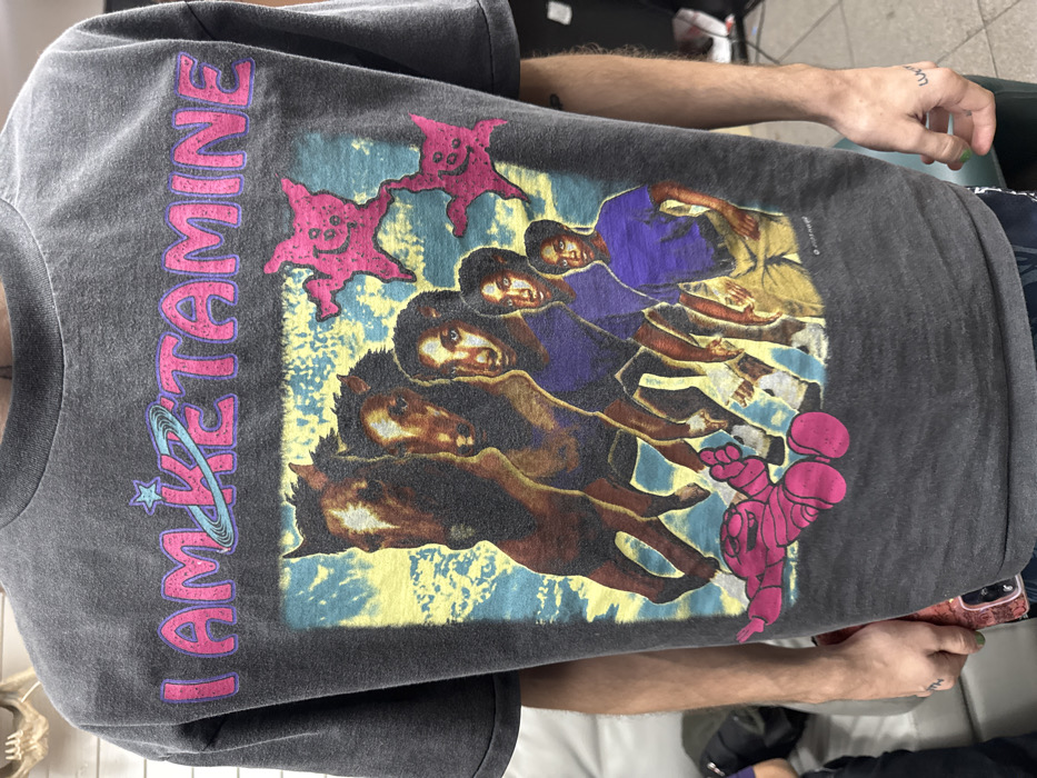A gray t-shirt displays a print with surreal imagery. The text "I AM KETAMINE" in pink lettering, features a star and ringed planet. Below, a group of people atop horses is depicted, rendered in earth tones with blue and yellow accents. Above and to the side, cartoonish pink figures with smiling faces add a playful element.