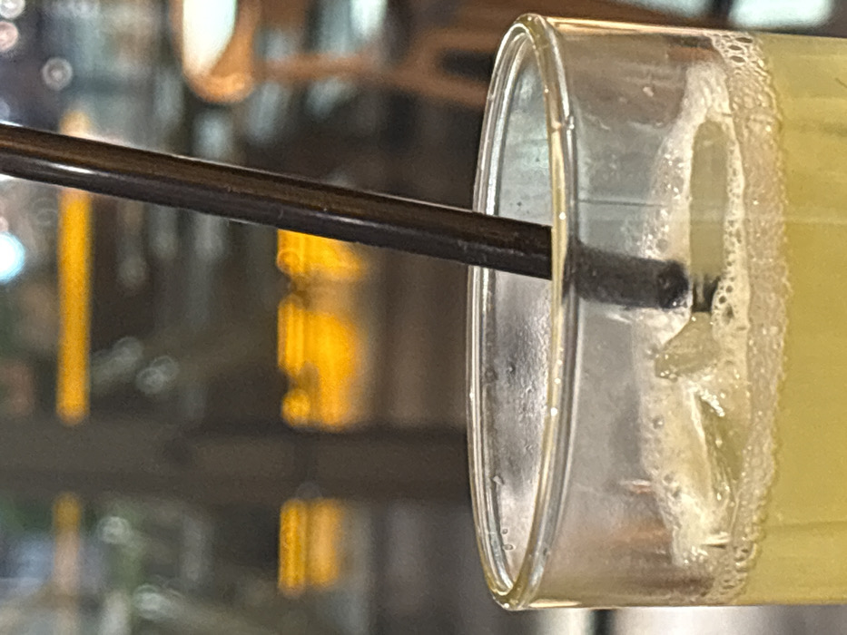 - "The image displays a close-up, shallow-depth-of-field view of the upper portion of a clear glass containing a light yellow, carbonated beverage with visible ice cubes" by FM-sZqdx1, licensed under CC BY 4.0