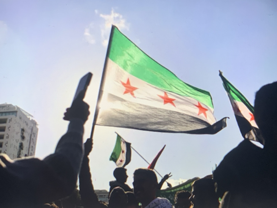 The image depicts a crowded outdoor scene in Al-Mazza Municipality, Syria, under bright daylight. The sky is predominantly blue with minimal cloud cover. In the foreground, multiple individuals are silhouetted against the bright background. A prominent Syrian opposition flag (three horizontal stripes of green, white, and black, with three red five-pointed stars on the white stripe) is held aloft in the center-right, waving. Other smaller flags of the identical design are visible among the crowd, particularly to the left. One silhouetted individual in the upper center is seen holding a smartphone horizontally with both hands, pointed towards the scene, potentially recording or photographing. A multi-story, light-colored building with a grid-like facade is partially visible in the upper left background. The overall impression is a gathering or protest.