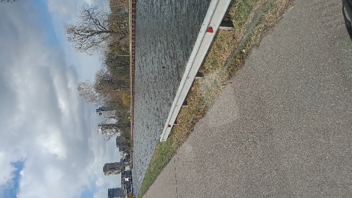 The image displays an urban waterside scene in Amsterdam, Netherlands, specifically along a canal in the Zuidas district, likely the Boerenwetering. In the foreground, a gray, asphalt-paved path or roadway extends from the lower left towards the mid-ground. Adjacent to its right edge, a silver-colored metal guardrail with white support posts runs parallel to the path. Several red reflectors are mounted on the top rail of the guardrail. Dry, brownish-green grass and sparse vegetation are visible between the path and the guardrail, and extending down to the water's edge. The mid-ground features a wide body of dark, rippled water, consistent with a canal. A small, dark, indistinct object floats on the water surface towards the right. The far bank of the waterway is defined by a dark brown or reddish-brown retaining wall or embankment structure. Behind this, a line of deciduous trees, mostly bare of foliage, extends across the frame. Some smaller trees or bushes with faint yellow-green growth are also present. In the background, a cluster of modern high-rise buildings dominates the skyline. Notable structures include a distinctively twisting, light-colored building (The Valley) slightly left of center, and a taller, more conventional skyscraper to its right. To the far left, another multi-story, darker-faced building is visible. The sky above is partially cloudy, displaying large white and gray cumulus clouds interspersed with patches of blue. No people are visible within the scene. The lighting indicates daytime conditions.