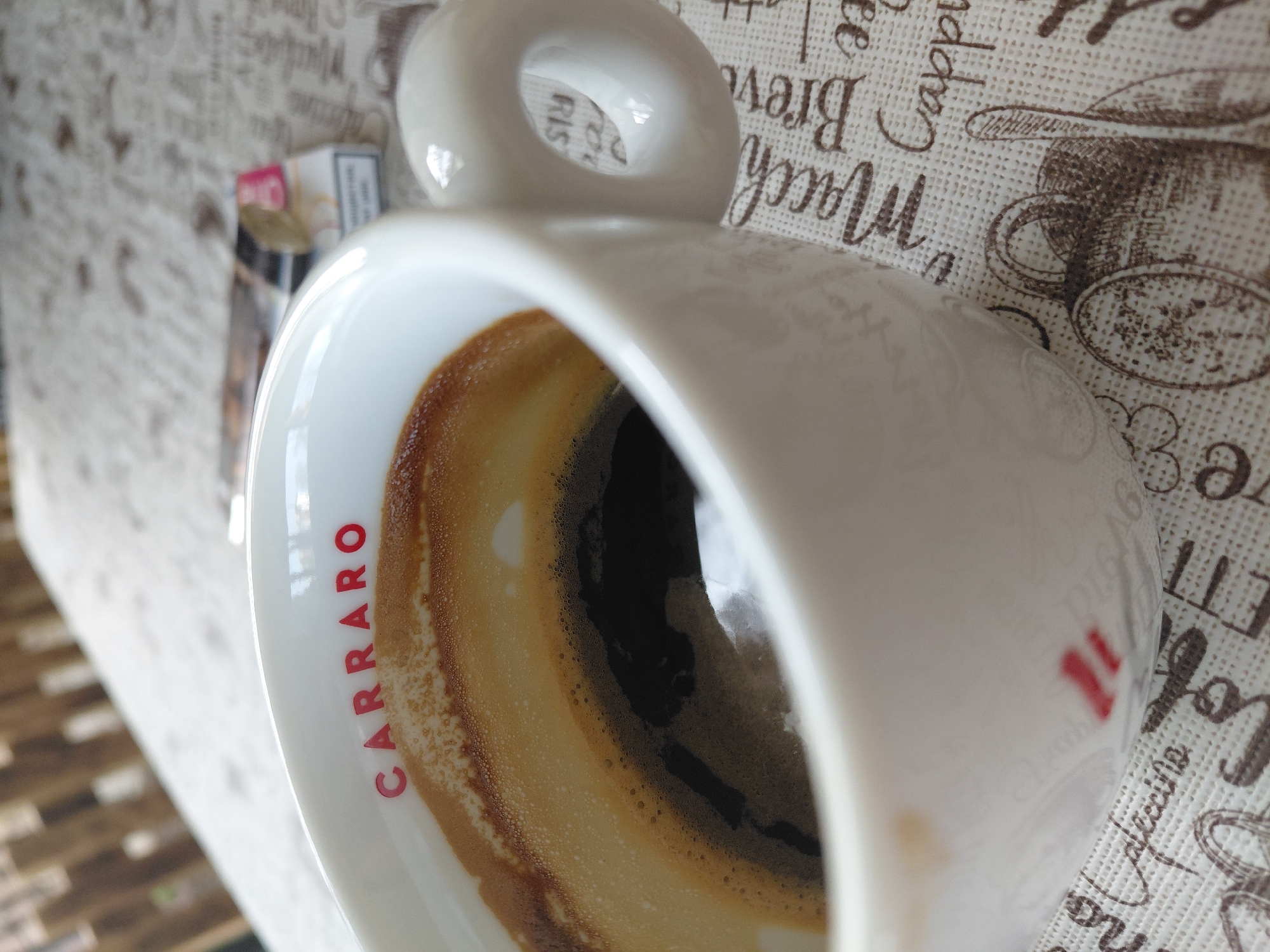 - "A close-up, angled view of a white ceramic coffee cup with the word "CARRARO" printed vertically in red letters on its side" by FM-ROYAa2, licensed under CC BY 4.0