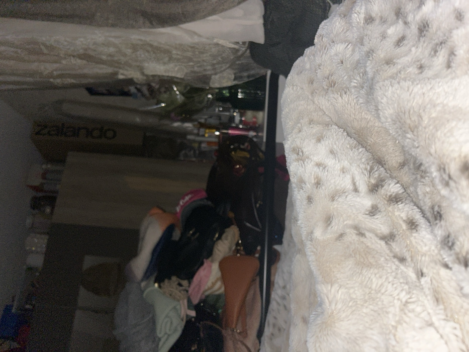A dimly lit closet crammed with belongings is visible. A box with "Zalando" printed on its side sits atop a shelf. Beneath the shelf, clothing and accessories, including a pink hat and several bags, are piled haphazardly. A plush, patterned blanket or garment takes up much of the right side of the frame. Another darker-colored blanket or pillow is also present in the upper portion of the image.