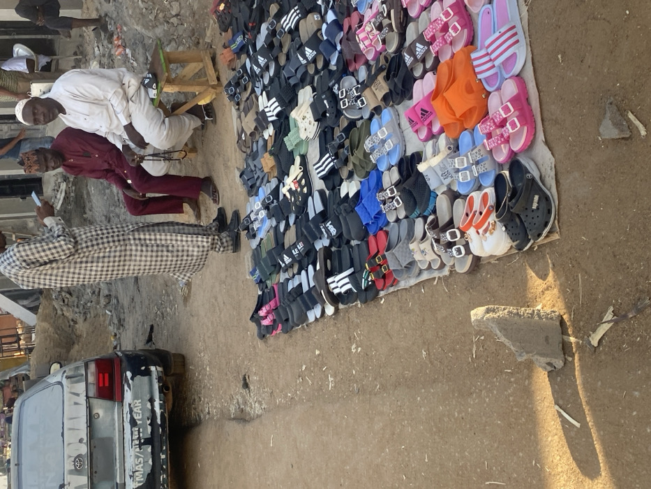 The image presents an outdoor market scene in Kaduna South, Nigeria, set on an unpaved, dusty ground under bright natural light, casting distinct shadows. A large array of diverse sandals, slippers, and clogs, featuring various colors and styles, including items with Adidas and 'SUPREMA' branding, is displayed on a light-colored sheet spread directly on the ground, dominating the lower-right and central portions of the frame. Three adult males are visible in the midground. One male stands on the left, dressed in a checkered long-sleeved tunic and trousers, intently interacting with a white smartphone held horizontally. To his right, two other males are seated on simple wooden stools. The individual closer to the standing man wears a maroon long-sleeved shirt, trousers, and a patterned cap. The individual seated further right is clad in a white long-sleeved tunic and a white skullcap, holding a string of prayer beads in his left hand. On the far left, the rear of a dark-colored Toyota sedan is parked on the dirt road, its bumper exhibiting faded white lettering that includes "TMAS/NEW YEAR". The background reveals partially constructed concrete-frame buildings and several indistinct individuals. A substantial piece of light-colored concrete debris is visible on the ground in the lower-left quadrant.