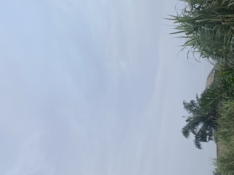 Overcast sky dominates the scene, taking up the majority of the frame. On the right side, various tropical plants, including palm trees and tall grasses, extend into the picture. A section of a building is barely visible, partially obscured by foliage. The orientation is sideways, with the sky appearing to be on the left.