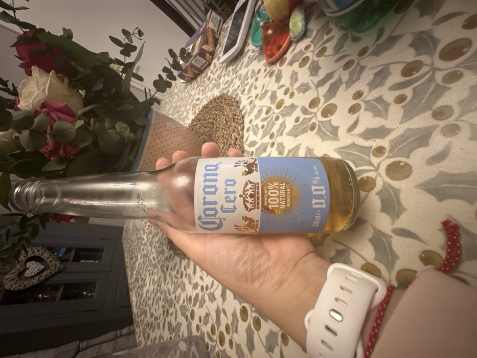 An indoor scene in Macclesfield, United Kingdom, captured from a slightly elevated perspective. A fair-skinned human hand, adorned with a white digital watch on the left wrist and a red and white patterned string bracelet, holds a clear glass bottle of "Corona Cero" (0.0% alc, 330ml) by its body. The bottle's label features "Corona Cero" in blue text, a crown logo, and text stating "BREWED WITH 100% NATURAL INGREDIENTS." The bottle contains a light amber liquid. The hand and bottle are positioned over a table covered with a light-colored tablecloth patterned with grey holly leaves and golden berries. To the right of the hand, a circular woven placemat is visible. Further right, on the tablecloth, are several items: a white remote control, a dark-colored smartphone or similar device, a partially visible packet of what appears to be "Tesco" branded food (possibly pastry-related), and several children's toys including a red and black ladybug-shaped item and a colorful stacking toy component. In the background, behind the bottle and placemat, is a floral arrangement in a textured, light-brown or terracotta-colored pot. The arrangement consists of white and pink/red roses, accompanied by green eucalyptus-like foliage. To the far left, a dark wooden cabinet or dresser with a decorative wicker heart-shaped object hanging on it is partially visible. The lighting suggests an indoor evening or low-light setting.