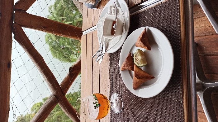 The scene depicts an elevated outdoor dining area in Bwishyura, Rwanda. In the foreground, a light brown wooden table is partially covered by a dark brown woven placemat. On the left side of the placemat rests a stemmed glass containing amber liquid with a head of foam, adorned with the "Virunga" logo. To its right, a white circular plate holds three triangular, golden-brown pastries (samosas) and a cut lime wedge. Further right, a second white circular plate displays a small white square bowl containing a reddish-brown sauce and a small spoon, accompanied by a fork and knife resting on a folded white napkin. The lower-left corner shows a silver-colored metal table support. The background reveals a robust wooden railing constructed from natural, rough-hewn logs, behind which a black diamond-patterned protective mesh net is visible. Beyond the netting, lush green tropical vegetation, including palm fronds, is seen, descending towards a expansive body of water, consistent with Lake Kivu, under an overcast sky. No individuals are present in the image.