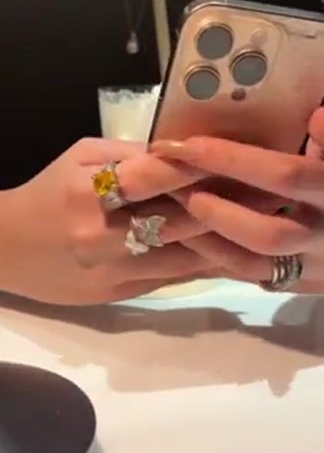 A woman is at a table in a restaurant, holding her phone. The focus of the shot is on her hands, adorned with several rings, including one with a large yellow stone and another featuring butterfly designs. Her nails are long and manicured. The background shows a drink in a glass with a straw, and a blurred view of the restaurant interior.