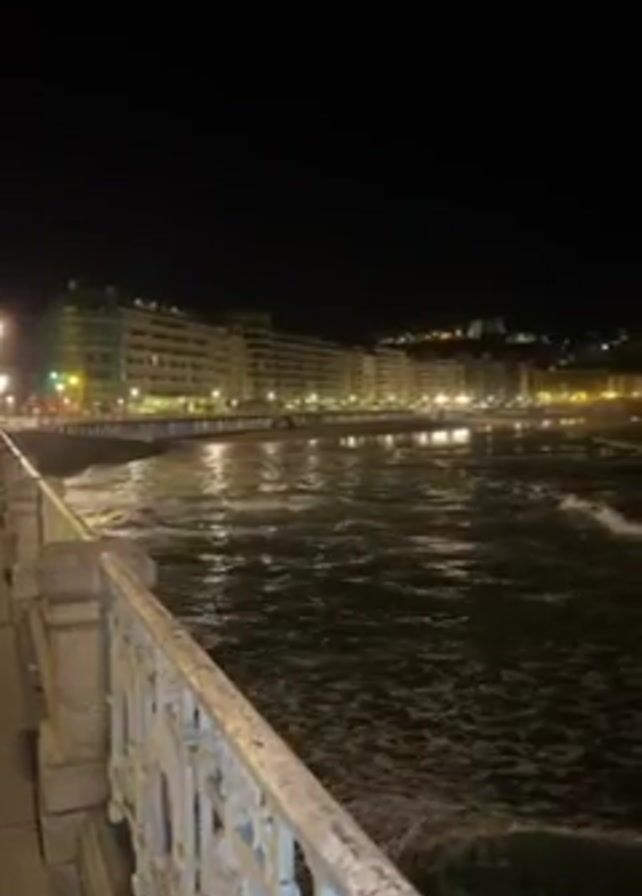 nighttime view of a coastline from a pier or bridge. The water is dark and choppy, with waves reflecting the city lights. A series of buildings line the coast in the distance, illuminated by streetlights. The pier or bridge has a decorative stone and metal railing in the foreground. The sky is black.