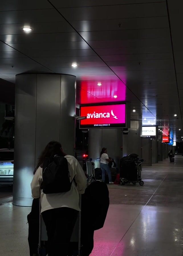 A woman wearing a black backpack and white top is walking along a covered outdoor walkway, pulling a cart with luggage. The walkway is part of an airport terminal, indicated by Avianca signage above. There are other people in the background and parked cars are visible outside. The area is well-lit with artificial lights.