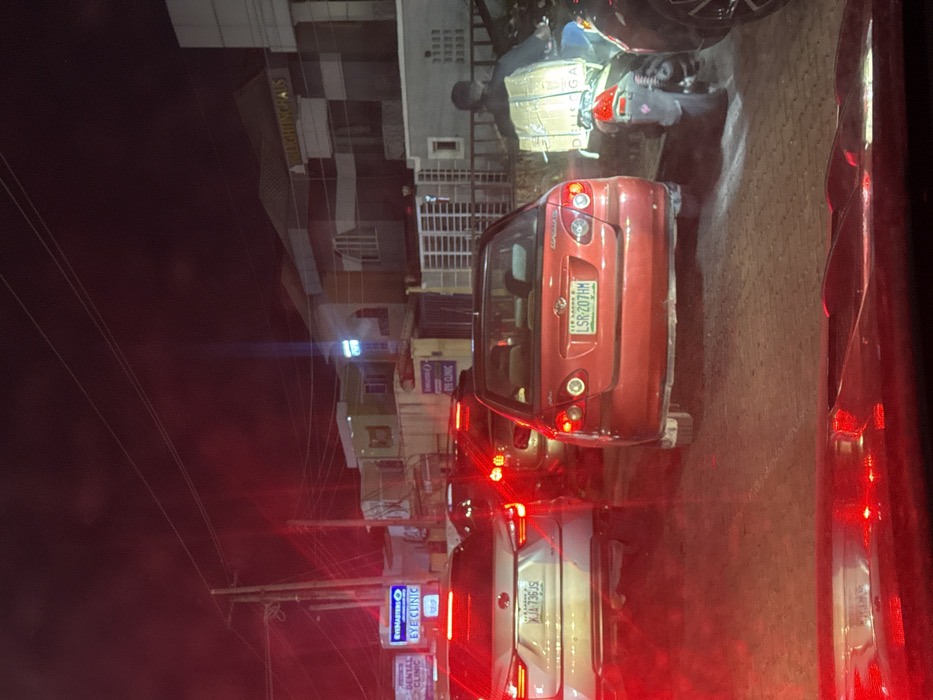 At night, a line of vehicles is stopped on a street. A red Toyota Corolla displays the license plate "LSR-207HM." Behind it, a white vehicle has "KJA-736JS" on its plate. A motorcycle laden with packages is also present. Street signs indicate "DENTAL CLINIC" and "EYE CLINIC." Buildings line the street, including one labeled "LIGHTINGHAUS." Power lines stretch overhead against the dark sky. The red taillights of the vehicles illuminate the immediate surroundings.