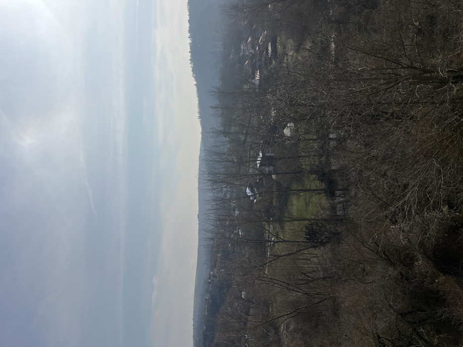 An elevated, wide-angle shot captures a panoramic view of the Cherven, Bulgaria area under a bright, hazy sky with sparse clouds. The upper two-thirds of the frame consists of a light blue sky with a prominent bright light source, likely the sun, in the upper right quadrant, casting a soft glare. Below the horizon, distant, tree-covered hills stretch across the background, appearing somewhat obscured by atmospheric haze. The midground reveals a valley or low-lying area dominated by numerous deciduous trees, currently bare of leaves, suggesting a winter or early spring season. Interspersed among these skeletal trees are clusters of residential buildings with various roof types, indicating a village or small settlement. Patches of vibrant green grass are visible between the tree clusters and buildings. The foreground is heavily populated by dense, bare branches and twigs of trees and shrubs, obscuring the immediate ground plane and framing the scene. No individuals or specific activities are discernible.