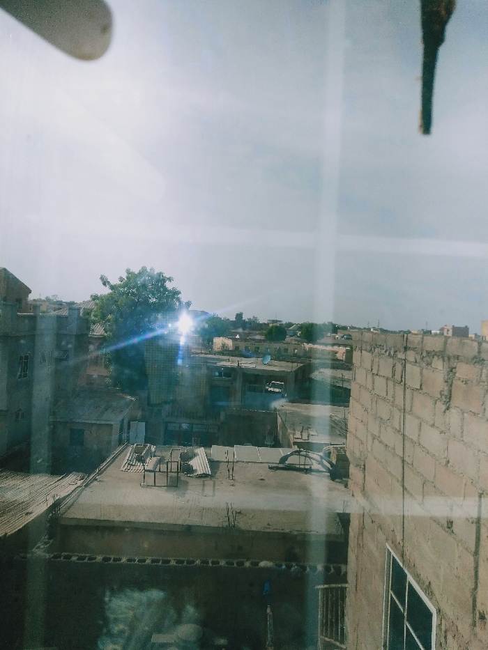 This image presents an elevated, wide-angle view of an urban landscape in Fagge D2, Nigeria, captured through a reflective surface, likely glass. The scene is dominated by a dense arrangement of low-rise buildings, predominantly constructed from light-colored concrete blocks. Most structures feature flat roofs. In the mid-ground, multiple rooftops are visible; one in the lower-middle shows corrugated metal sheets stacked and a metal framework, while others exhibit various objects, possibly including solar panels or water tanks, and plumbing. To the immediate right, a substantial section of a concrete block wall forms part of a building, featuring a dark-framed window opening in its lower portion. Another multi-story building with a square or rectangular footprint is visible on the far left, featuring window openings. A prominent green tree with dense foliage stands in the mid-ground, slightly to the left of the image center, partially obscured by significant lens flare and sun glare emanating from a bright light source (presumably the sun) positioned in the upper-middle left portion of the frame. The sky is overcast or hazy, presenting as a light grey. No discernible people, explicit actions, or direct interactions are visible. The image exhibits reflections and distortions consistent with being photographed through a window, including subtle vertical and horizontal light lines across the scene, and a blurry, dark, irregular object in the upper-left, and an elongated dark object in the upper-right, suggesting parts of the camera or immediate surroundings. The overall lighting is bright, with strong glare from the central light source.